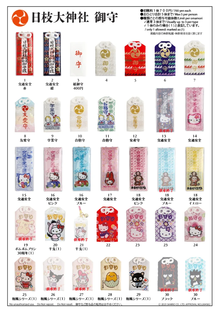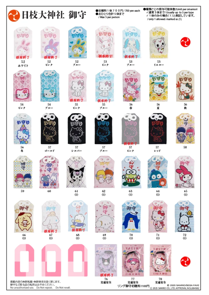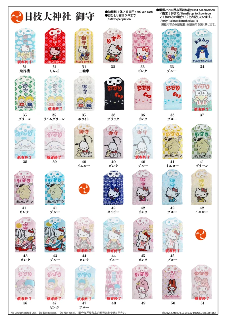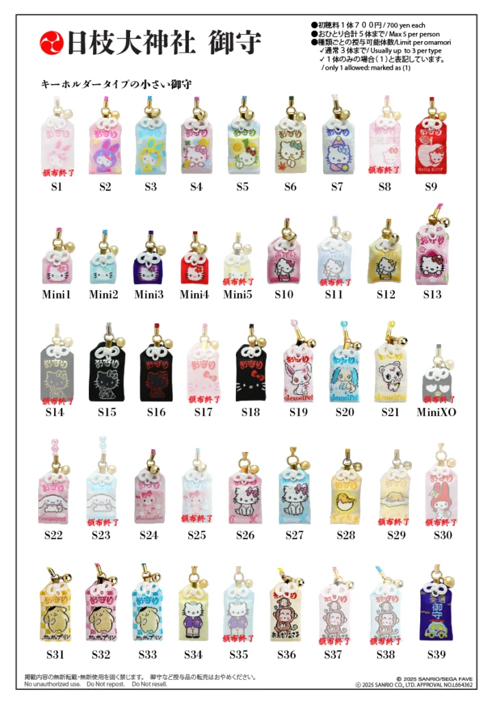 サンリオキャラクター御守はおひとり合計5体までとさせていただいております。